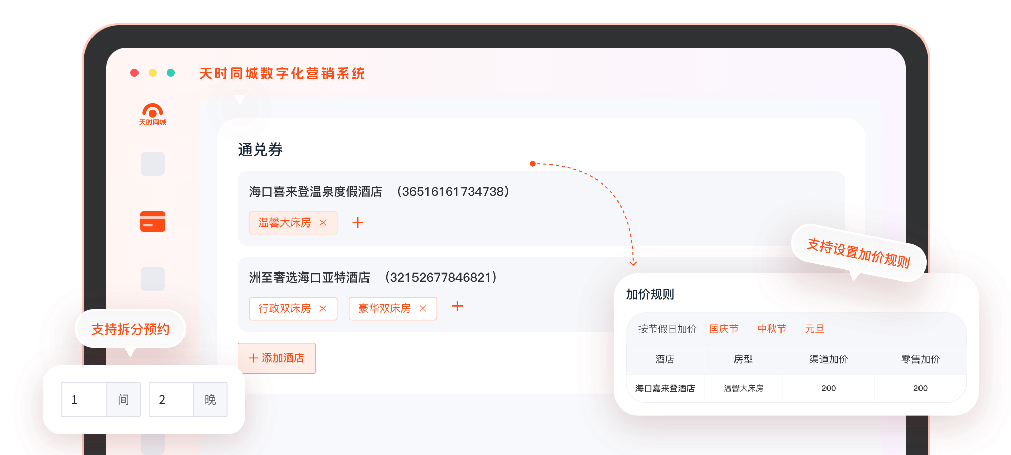 酒店通兑券支持预售产品关联多个酒店多个房型,客人购买通兑券后,可在多个酒店下选择任意一个酒店的任意房型进行预约。支持设置多间夜套餐,支持设置拆分预约