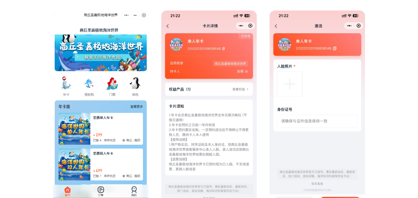 年卡产品可在多平台渠道销售,并统一在小程序商城进行线上激活操作;前端操作清晰简单,持卡列表、使用记录等数据均可在后台便于查询,清晰管理!